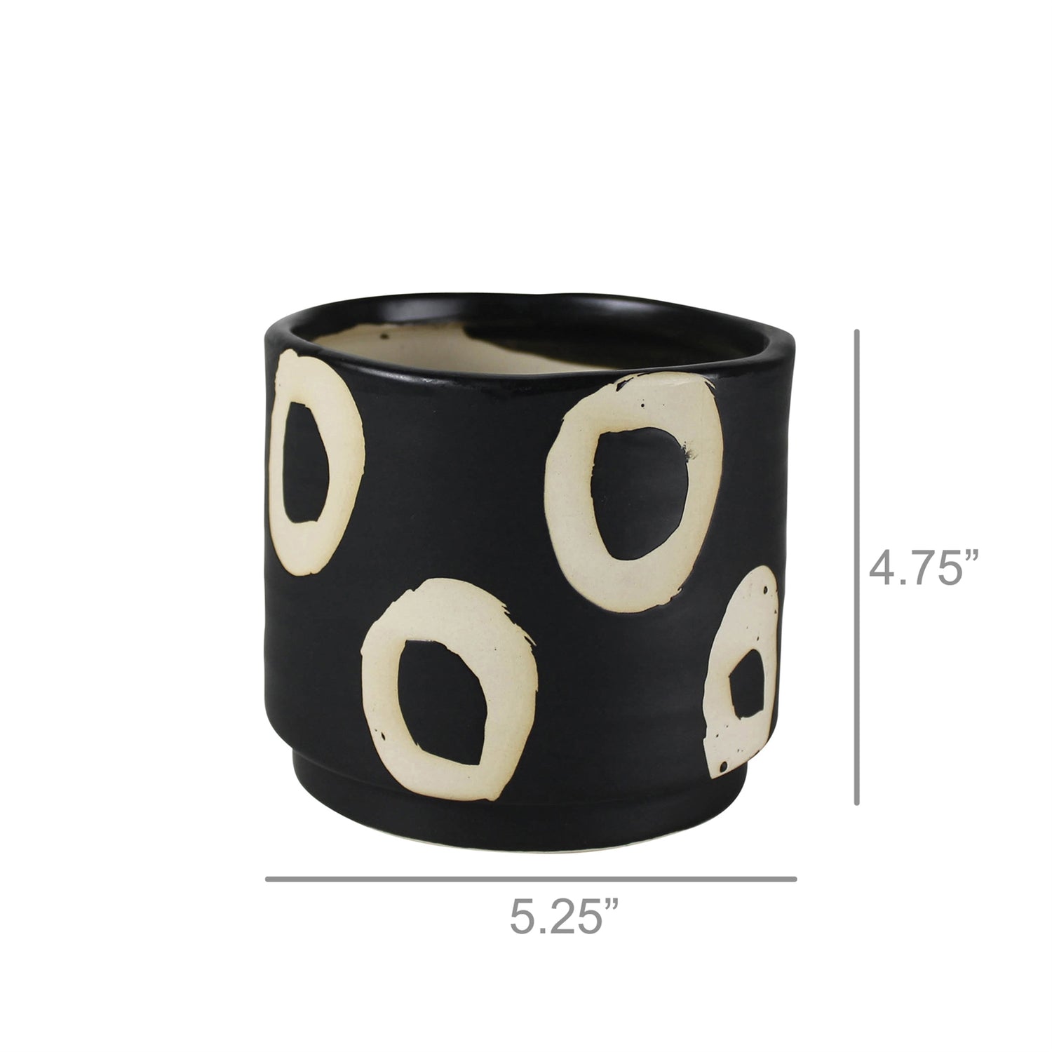 Mud clay vase or pot in matte black with ivory ovals. Available in small and large (both sizes are shown). Contemporary with an ethnic twist.