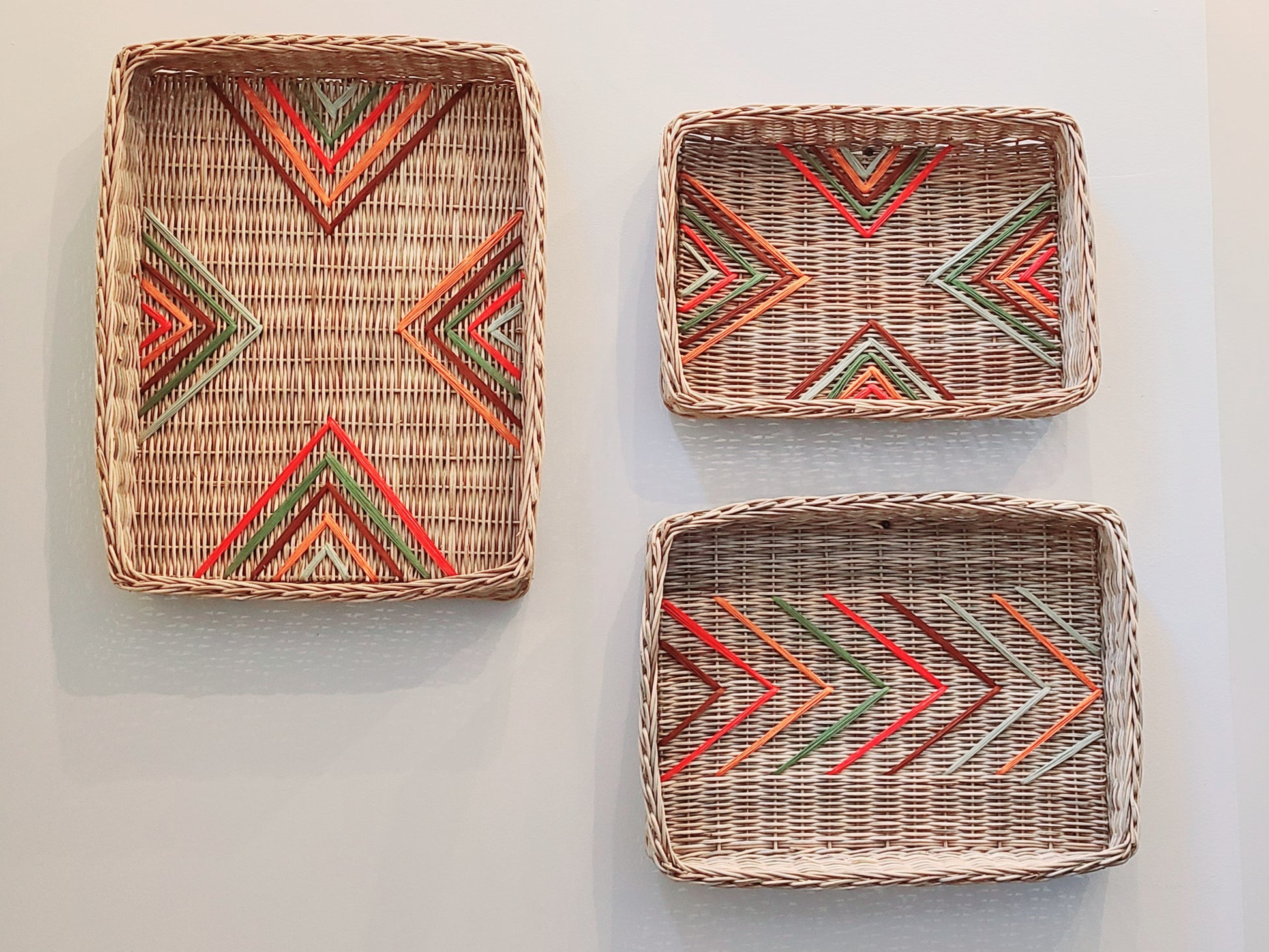 Organic rattan trays with pops of accent colors hand woven in "V" shapes. Great for a unique wall display or for a tabletop/vanity storage accent. Inside stitching colors are red, orange, dark brown, and grass green. Sold as set of three (3).