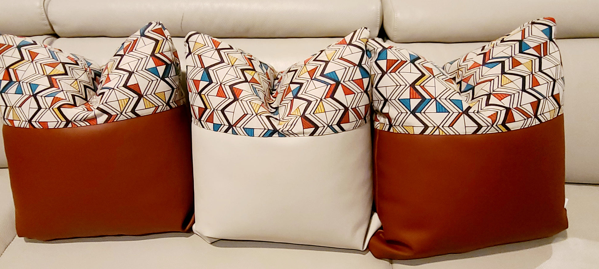 Yes...vegan leather pillows mixed with a colorful tribal print addition. Goose down like insert that makes for the perfect karate chop. Oversize pillows bringing both style and comfort to any space. Can fit in both a formal and relaxed setting. Available in Two (2) colors.